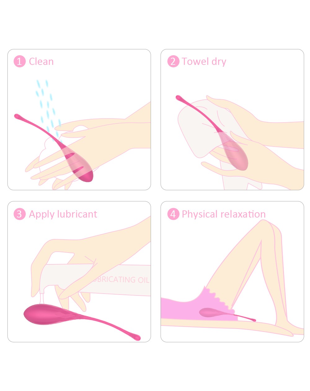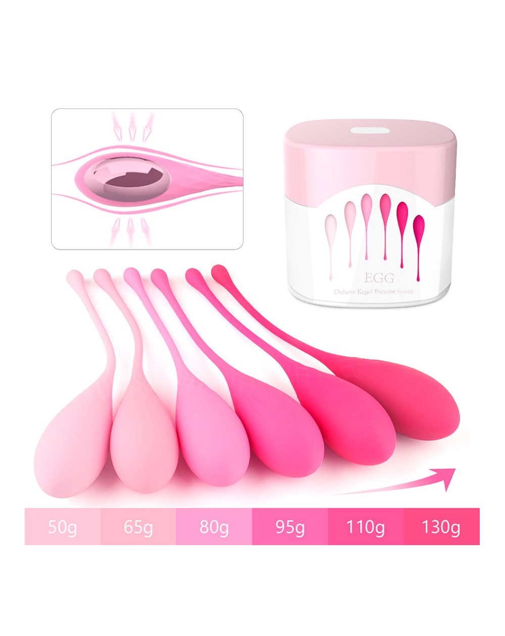 Principio de gravedad: después de poner la bola de Kegel en el cuerpo, los músculos vaginales apretarán la bola de Kegel inadvertidamente bajo el efecto de gravedad, logrando así el efecto de ejercicio.